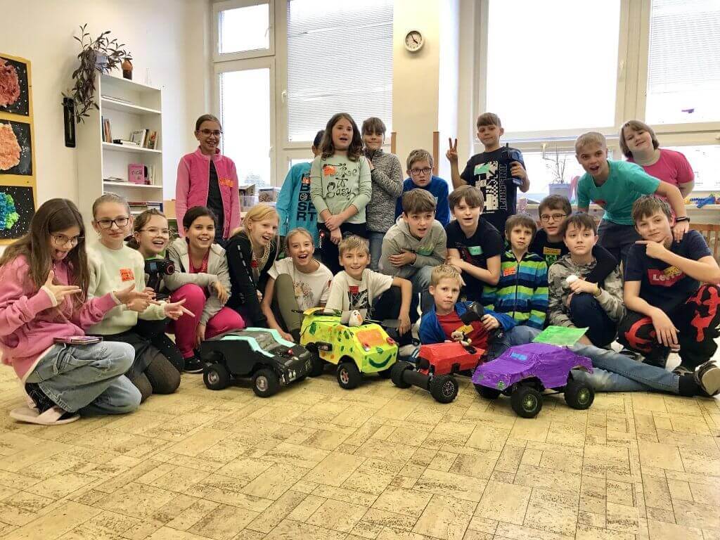 Using play money, children in teams come up with their own designs, purchase “building materials,” and creative components. Children will experience teamwork, creative thinking, entrepreneurial mindset, financial literacy, dexterity, and communication. They complete various tasks related to their age in English, physics, mathematics, and others, as mentioned below. With the finished cars, we compete on a prepared race track or go on an expedition around the school (if suitable space is available).